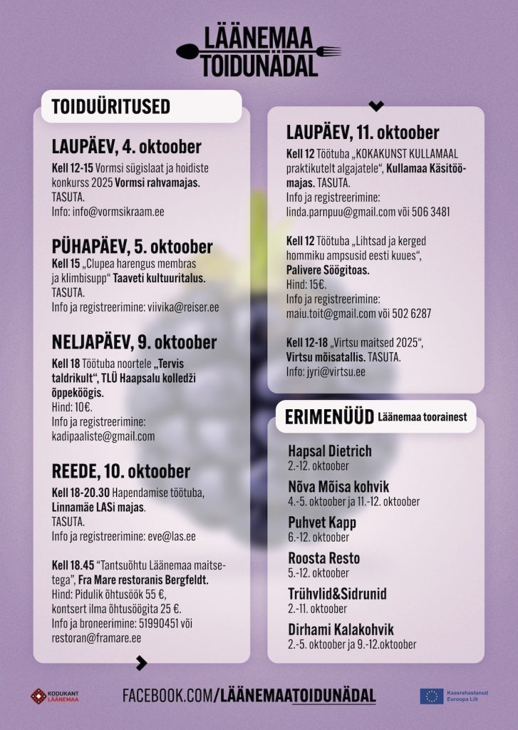 Lisaks restoranide erimenüüdele ootab huvilisi rida inspireerivaid sündmusi, mis tutvustavad Läänemaa toidupärandit, tervislikke toitumisharjumusi, hoidistamise oskusi ning pakuvad võimalust kokata koos noorte, kogukondade ja kohalike meistritega: